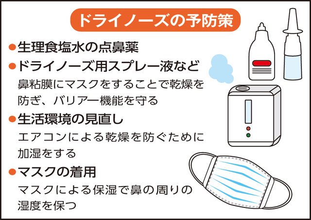 室内で過ごす場合は、湿度に気を配ることが予防につながる。マスクの着用も効果的だ。三輪院長は「ドライノーズにより生じる鼻粘膜のバリアー機能低下によってウイルスなどの感染リスクが高まります。バリアー機能を保つ先手のケア、つまり未病の段階で病気の原因を防ぐ“上流の医療”が何よりも大切です」とアドバイスする。(メディカルトリビューン=時事)(記事の内容、医師の所属、肩書などは取材当時のものです)