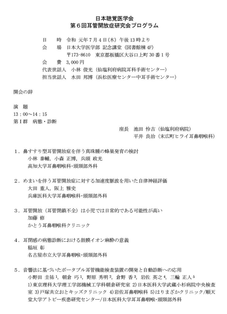 2019年7 月4 日(木)、日本聴覚医学会の第6回耳管開放症研究会プログラム第?群 病態・診断の分野において、『音響法に基づいたポータブル耳管機能検査装置の開発と自動診断への応用』と題した発表を行いました。